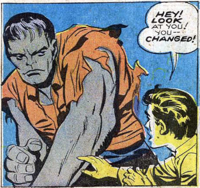 As mentioned earlier, the Hulk barely appears in the tale, the human drama of Bruce Banner's torment and his conflicts and interactions with those around him clearly being of more interest to Lee and Kirby than the limited spectacle of a muscleman walking around bending things.